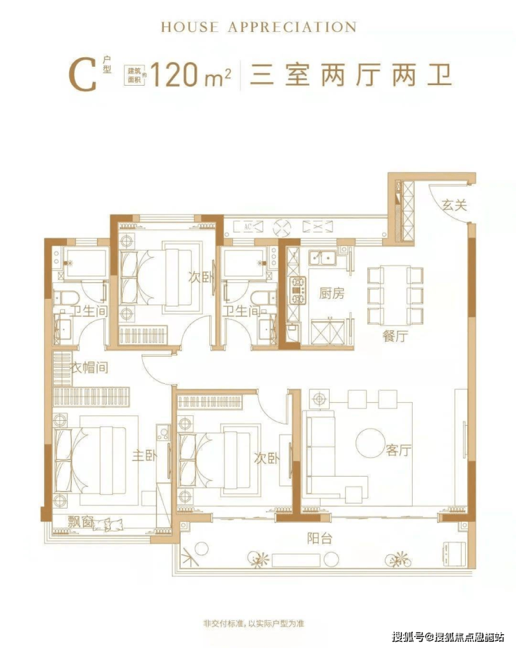 建面约120㎡的舒适三房是梦溪云庐的明星产品,该户型部分拥有270°飘窗。动静分区,主卧套房设计,既满足需要的舒适尺度,更彰显实用性。