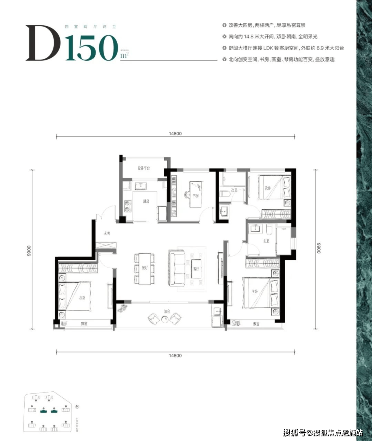 最大的 约150㎡大四房,2梯2户,南向四开间朝南,面宽做到了约14.8米;拥有霸气的约6.9米大横厅,连接一个双联阳台。