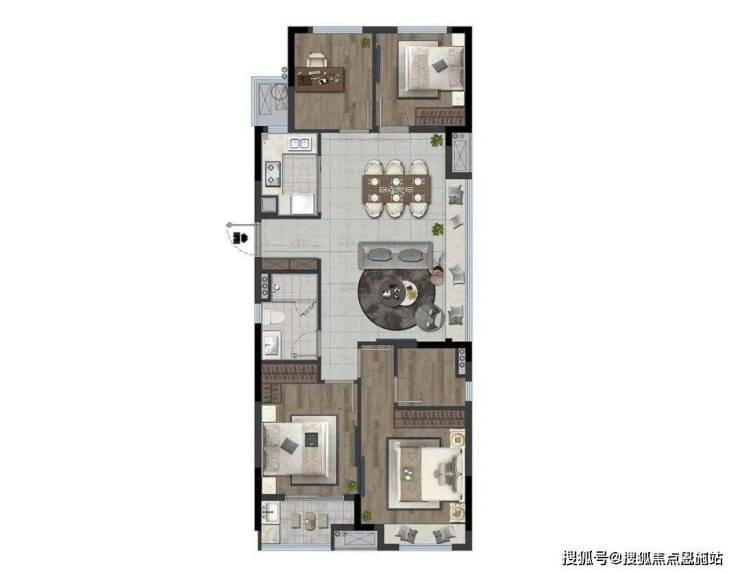 优势:112㎡规划成了四室两厅两卫,空间利用率相当高,整体是个加长版的四叶草户型。独立玄关,整体生活动线非常流畅。动静分区明显,主卧自成一体,设计贴心。