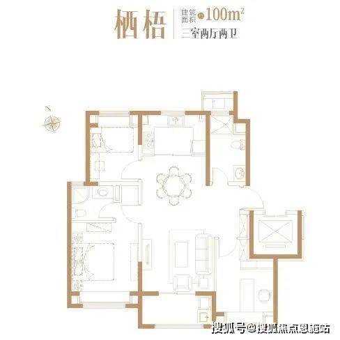 梧桐印象建面约100㎡的三室两厅两卫户型, 三开间朝南,厨房/餐厅/客厅一线贯之,是真正南北通透户型。