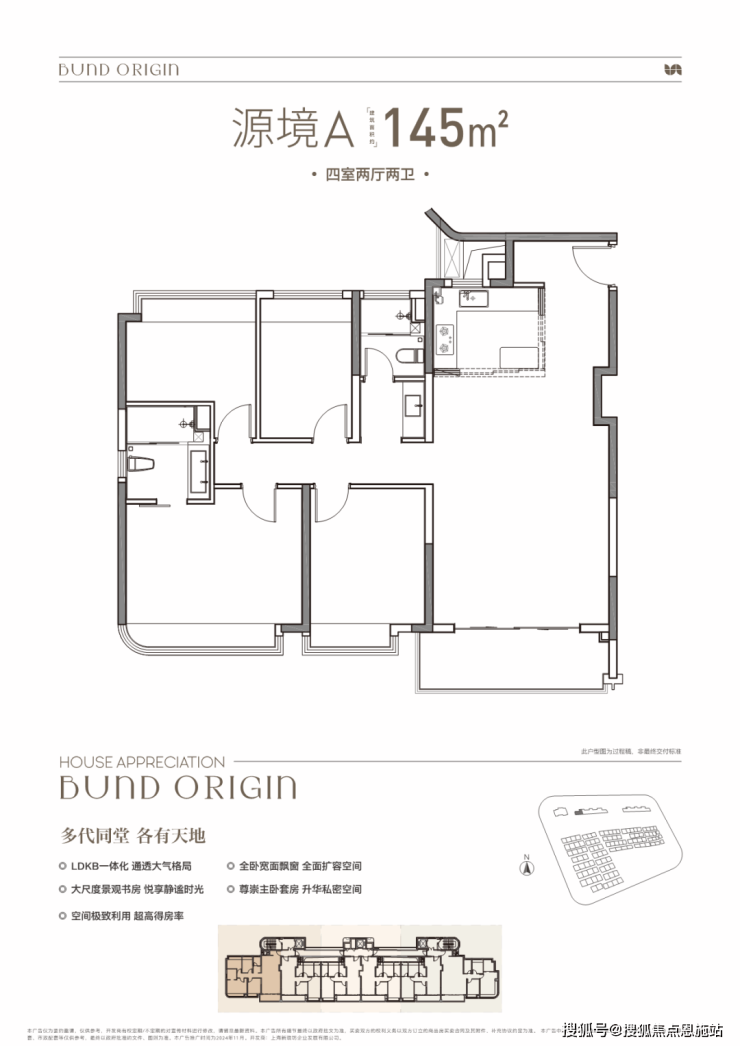 A户型是4房2厅2卫格局,三开间朝南+LDKB一体化+全卧室带飘窗+主卧套房设计+动静分离,居住功能性更强。
