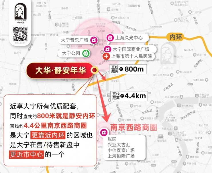 大华·静安年华直线距离静安内环仅约800米,咫尺就是静安内核璀璨繁华。
