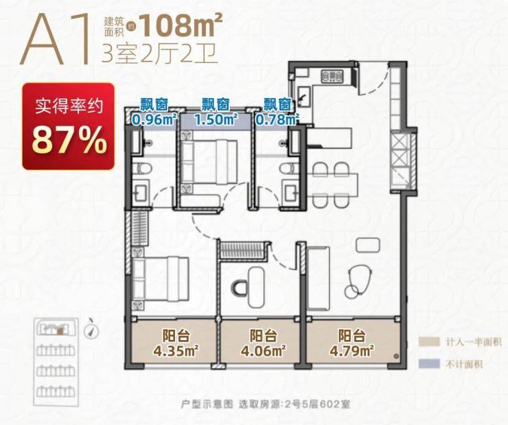 建面约108㎡3房A1户型:
