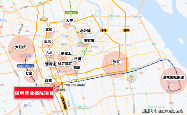 你看梅陇,15号线(已通车)、19号线(在建中)、机场联络线(即将通车)3轨交汇。再加上虹梅路高架直插中环外环,南侧银都路越江隧道2024年年底建成后,可直通“浦东金色中环”。