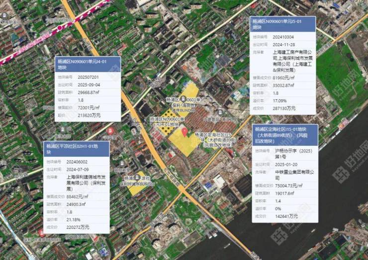 地块东侧,是今年1月20日,同样以协议方式出让的杨浦区定海社区I15-01地块(大桥街道89街坊),意向用地者为中铁置业集团有限公司,总价142641万元,楼面价75005元/㎡。