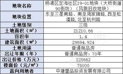 地块北侧是杨浦区N090601单元I4-01地块,出让面积16482.71㎡,容积率1.8,建筑面积29668.87㎡。地块起价213620万元,起始楼面价72001元/㎡。
