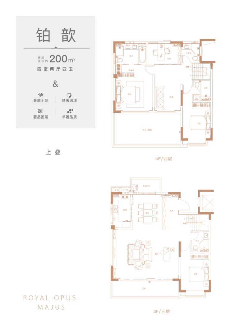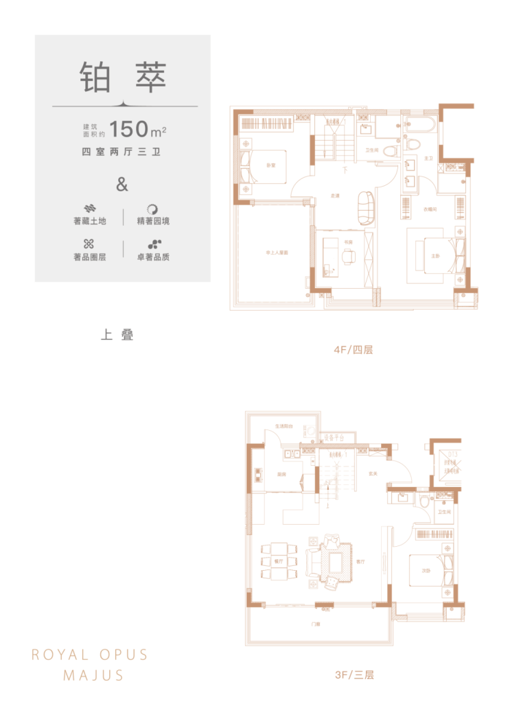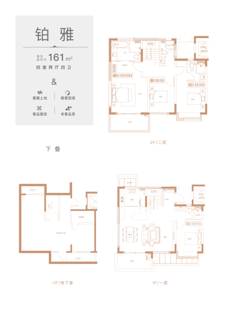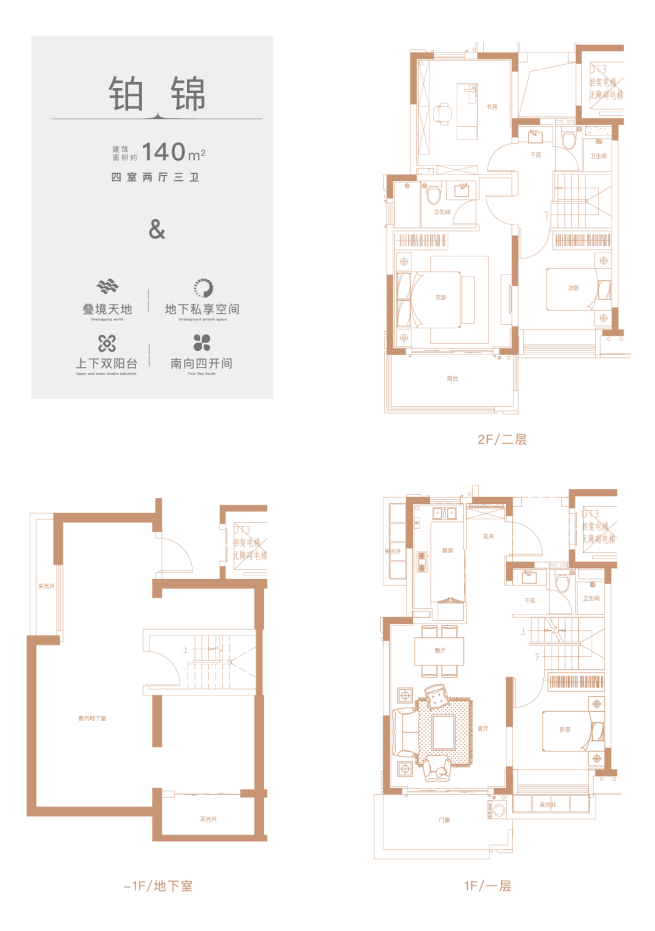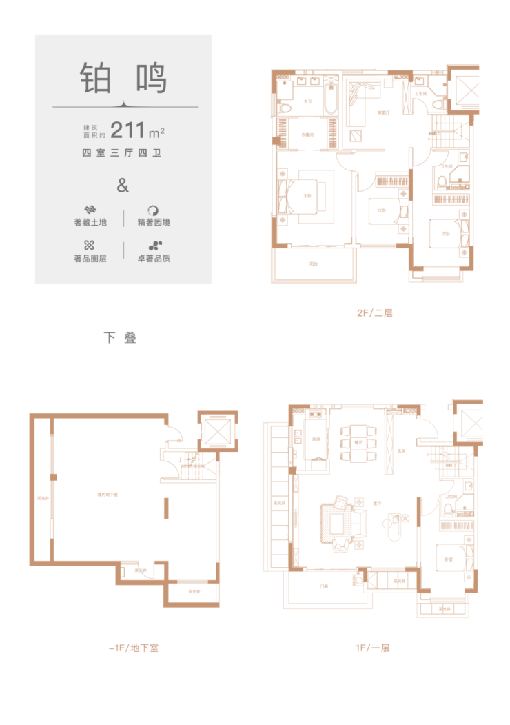 118㎡-211㎡的叠加产品,阔绰尺度,一层是人物的社交排场,一层是主人的静谧私享空间;套房式主卧安放人生细节与相濡以沫的初心;静谧书房,肆意挥洒豪情壮志或是静阅来自生活的诗篇;多一层地下空间,是全家的兴趣收藏室,也是挥洒汗水的健身房,百变空间,随心所想。