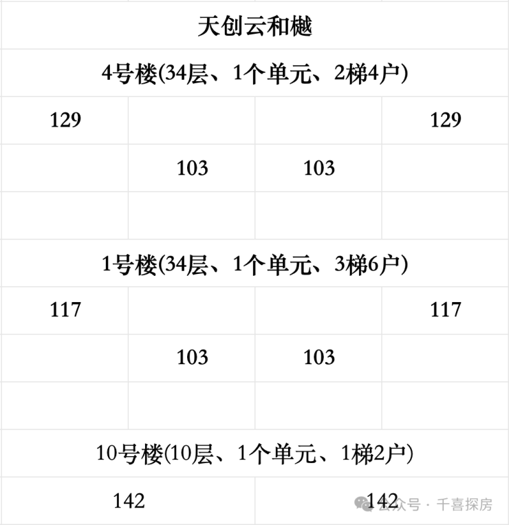 4号楼总高34层,一个单元,2梯4户,包含建面约103-129平房源