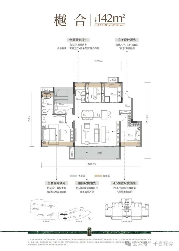 高层合同公摊约22%,优化后得房率约93%;洋房和小高层建面约142平,公摊15%,优化后得房率约103%。(楼栋公摊有差异,请以实际购房合同为准)
