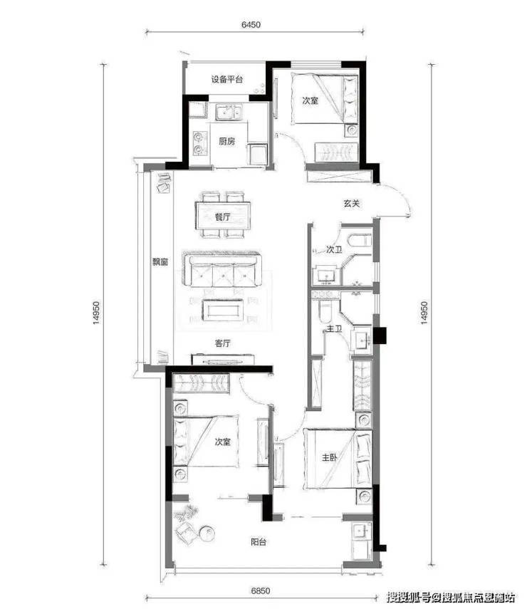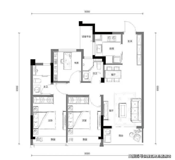 户型非常方正,南向面宽达到约9.3米,三开间朝南,卧室带飘窗,餐客厅连着阳台。