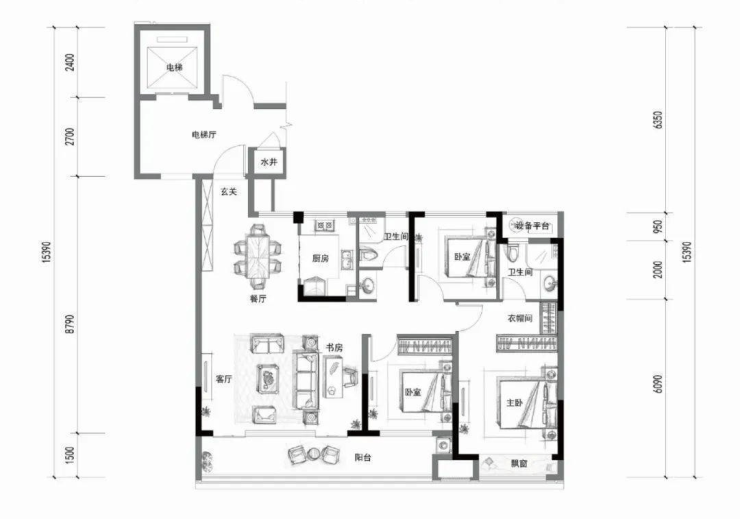 南向的餐厅与客厅一字排开,形成了一个南向面宽达到约6米的大横厅,餐厅南置的新颖设计赋予了这个日常低利用率的区域成为家庭学习、工作、交流沟通的重要空间。