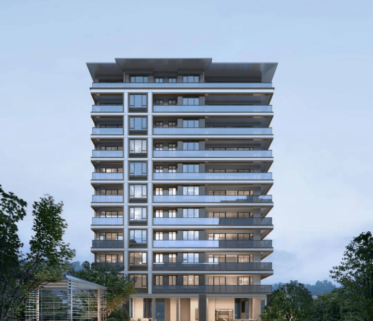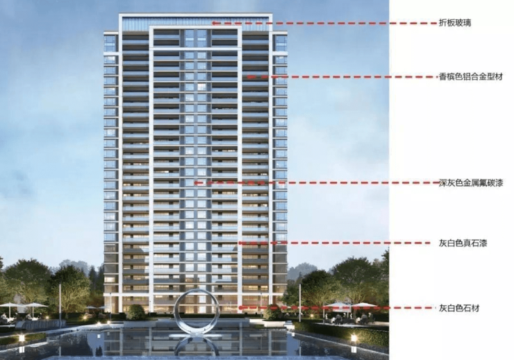 高层建筑以大面积LOW-E中空玻璃配以香槟金铝板镶边,品质感拔群;顶冠的折板玻璃,设计感十足;建筑基底采用灰白色石材干挂,经久不衰的高级质感。