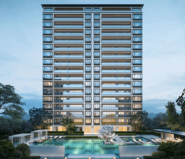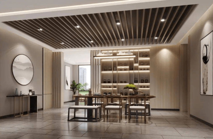 迎宾树阵、景墙、水庭……最浓墨重彩的一笔就是约600㎡的“蒂芙尼蓝”镜面泳池,湛蓝水池中碧波与建筑立面相映成趣,美不胜收。