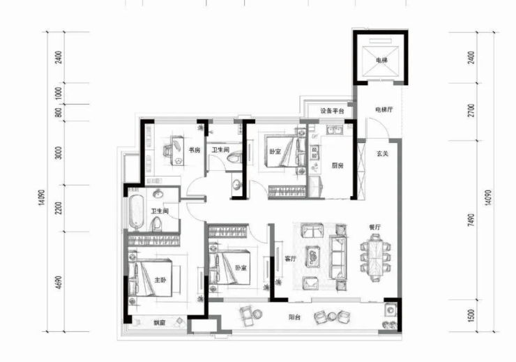 整个空间采用动静分离设计,最小卧室面宽也做到了约3米约3.8米的主卧本就相当舒适,还可以和北侧的书房联通,打造成堪比五星级酒店的奢适套房。