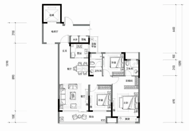 南向面宽约5.7米的餐客一体大横厅,连接一个面宽约8.8米的南向双阳台,相当气派,一家人可以与更多阳光、清风相伴于,其乐融融。