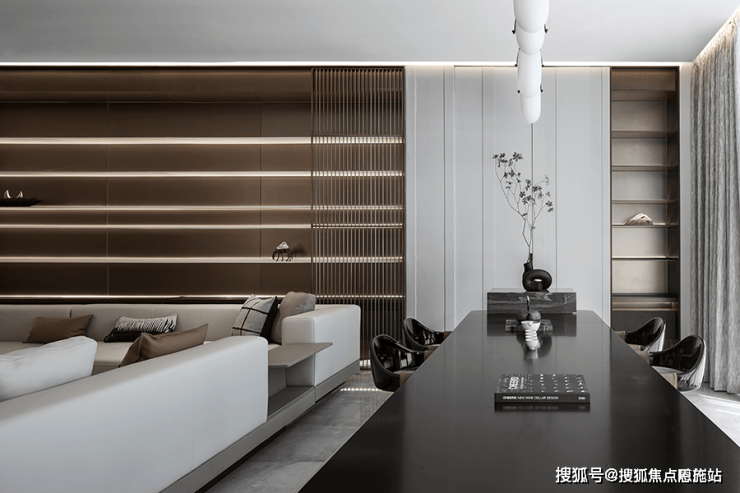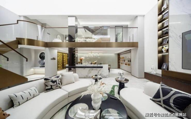餐厅 厨房与楼梯间,设立了开放的中岛台,形成视觉隔断,在增添功能性的同时,也流露出设计师严谨的美学思考,以及对空间节奏的把控!沿梯下行楼梯利用灯光,呈现出轻盈的悬浮感,夹层作为阅读空间延续了整体色调,在黑白之中求得平衡 不张扬 也不喧闹,弧形沙发和圆形茶几带来的包围感!