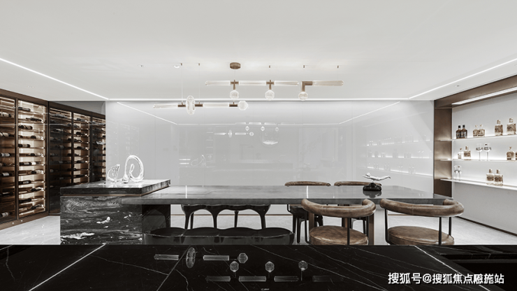 穿过岛台 另一侧是品酒室,大面积玻璃与石材细腻的纹路相结合,在起承转合间能够捕捉到,彼此细腻的纹理与形态,金属与皮质的加入加强了空间层次,沉浸酒香 闲适随性!透过视觉感官 激发内在能量,利用自然之韵,唤起人们对居住形态的迭代需求,德信浮山云湖印在沉稳中追逐未来,探索当代人居的更多可能!