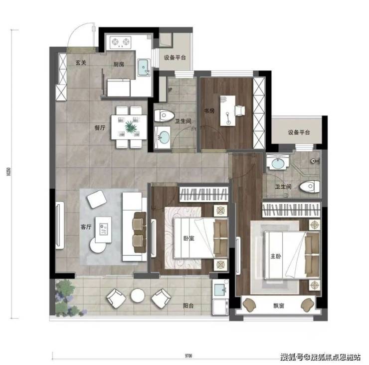 先说建面约99方户型,3室2厅2卫,是比较方正的户型。