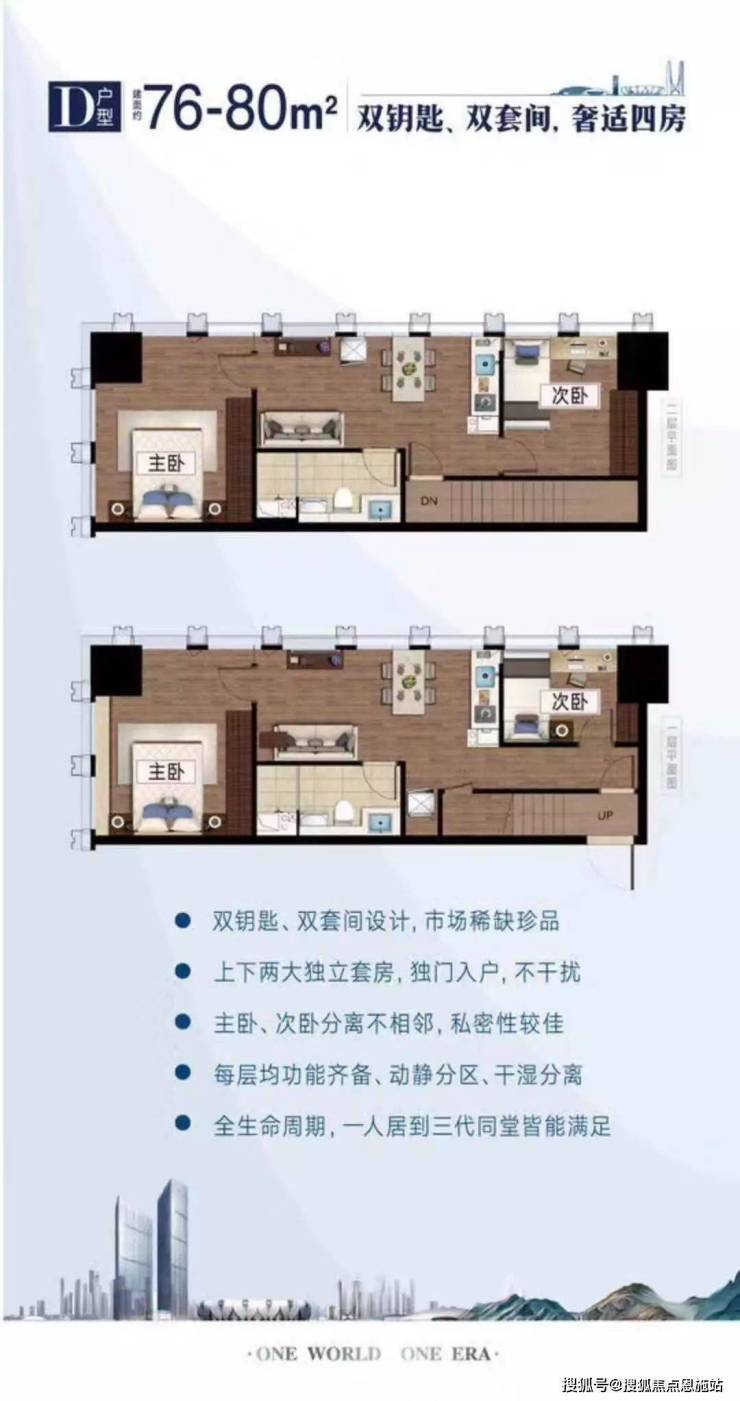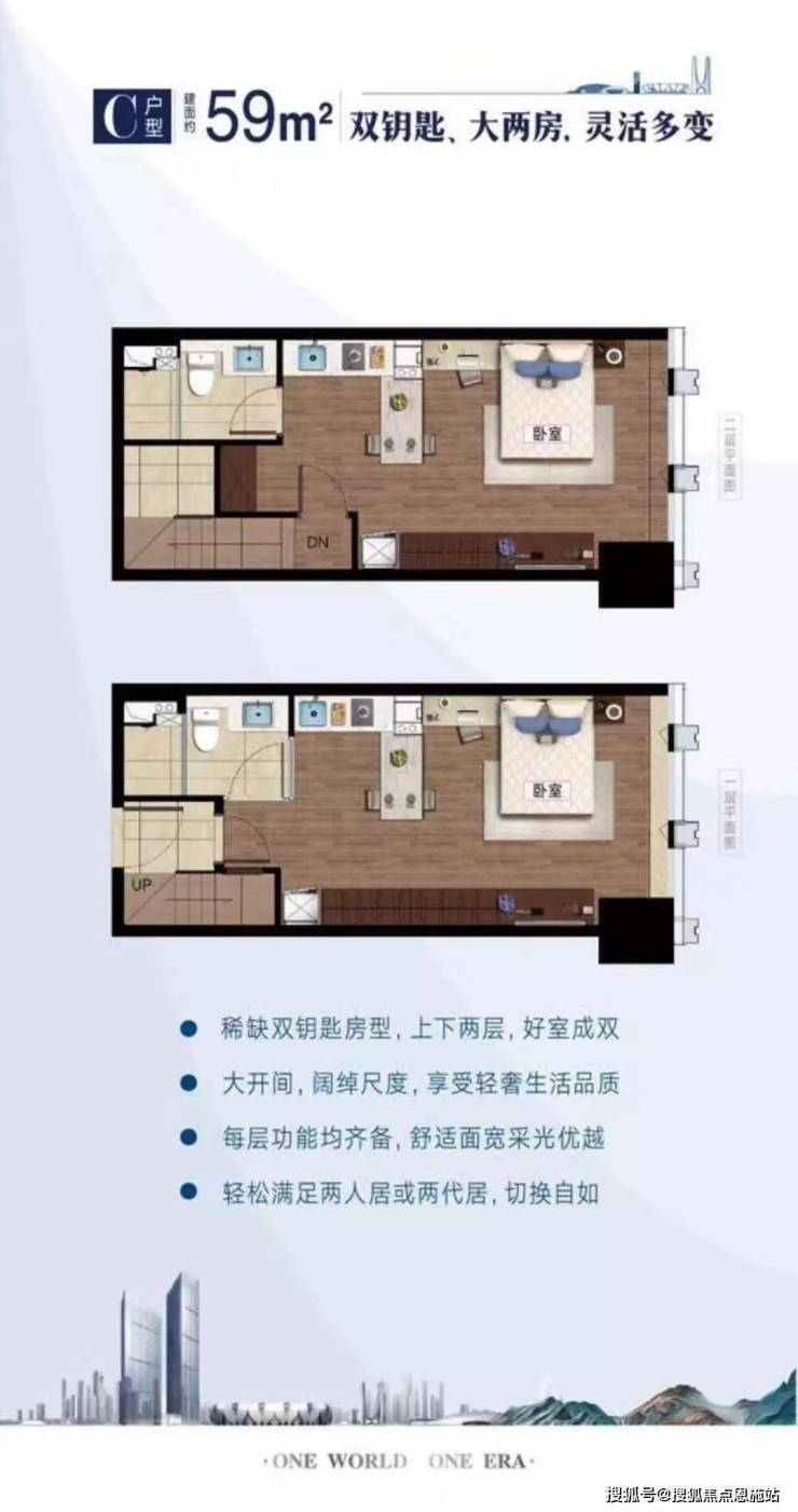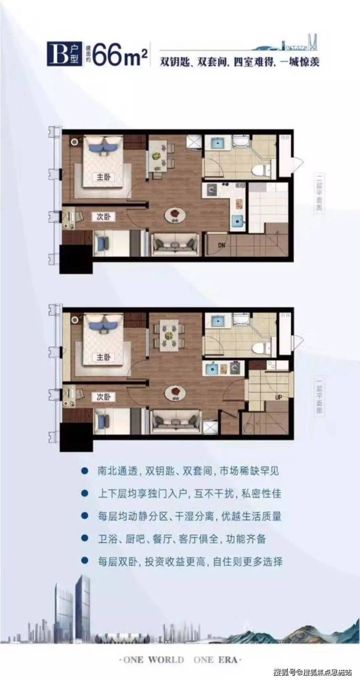 其次山水时代70方户型和大多的双钥匙房源一样,一室之内分为上下两个套间,每个套间均带有两室两厅一卫一厨的格局。主卧面积较大,有更多的收藏空间;靠窗区域设计有书桌和书柜