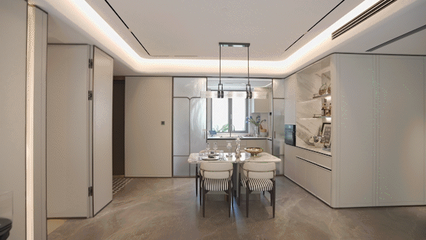 客厅、厨房地面采用希尔顿酒店御用的简一大理石连纹密封砖,约900*1800超大尺寸,堪称地砖界天花板;还有超薄悬浮吊顶设计,搭配皮革背景墙,空间格局不彰自显。