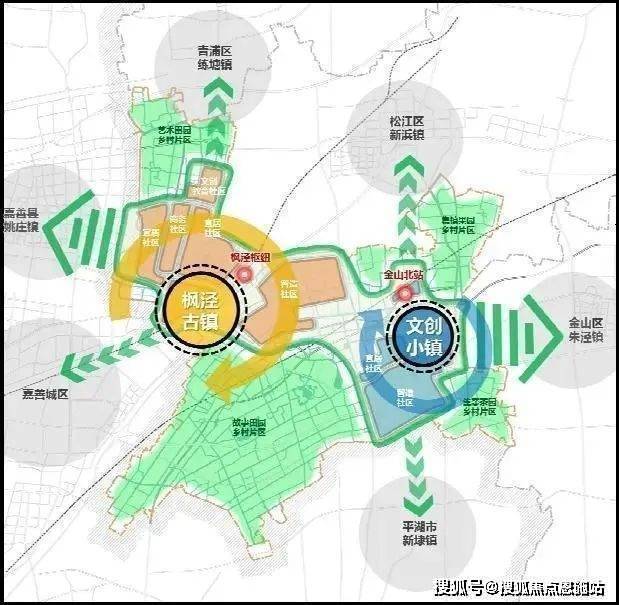 双核指两个片区,分别是西部以枫泾古镇为引领、枫泾枢纽为支撑的“文化+生活”功能片区,东部以文创小镇为引领、金山北站为支撑的“文化+科创”功能片区。