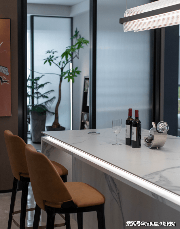 空间在材质搭配上,也是极尽雅奢可能。鱼肚白岩板打造的大岛台,营造温情的社交一隅;木饰面与金属软硬质感的碰撞,有序的墙面分割把握了整体空间的节奏感;双背景墙分别由鱼肚金岩板和劳伦黑金色系展墙组成彰显奢华。