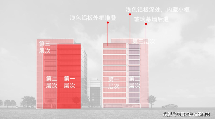 天泱雅筑通过建筑的挺拔比例,选用金属铝板装饰立面线框、浅色铝板外框堆叠、玻璃幕墙窗打造立面效果,呈现出明显的建筑体块层次感。