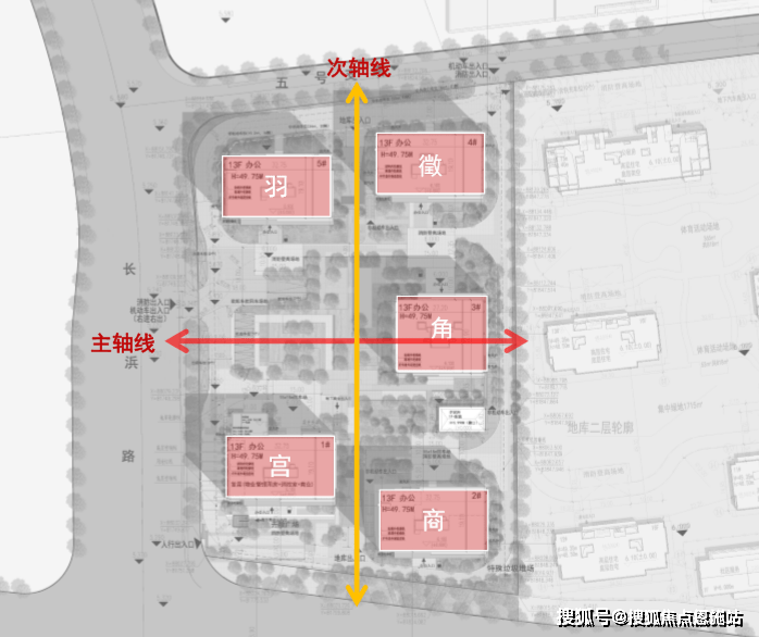 建筑布局以胡雪岩故居为灵感,“主次”双轴,与取意“宫、商、角、微、羽”五音律动的五形空间相应共融。