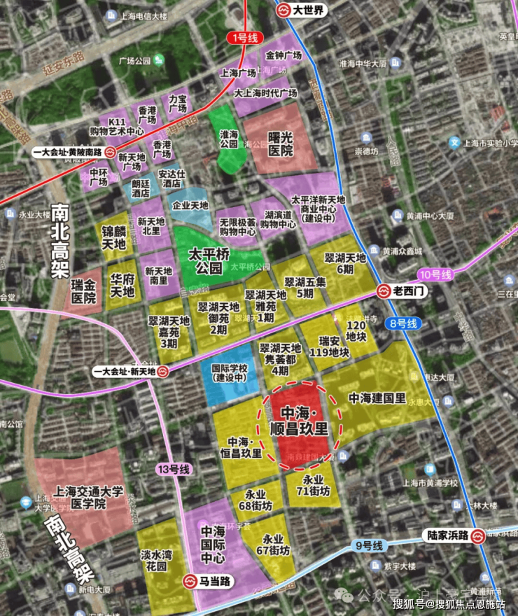 中海・顺昌玖里雄踞上海真正的城央烫金地段 —— 黄浦区新天地 。这里是 上海的心脏地带 ,是城市繁华与历史底蕴的交融之所。周边汇聚了上海顶级的商业、文化、娱乐资源,成为 无数人向往的生活主场。