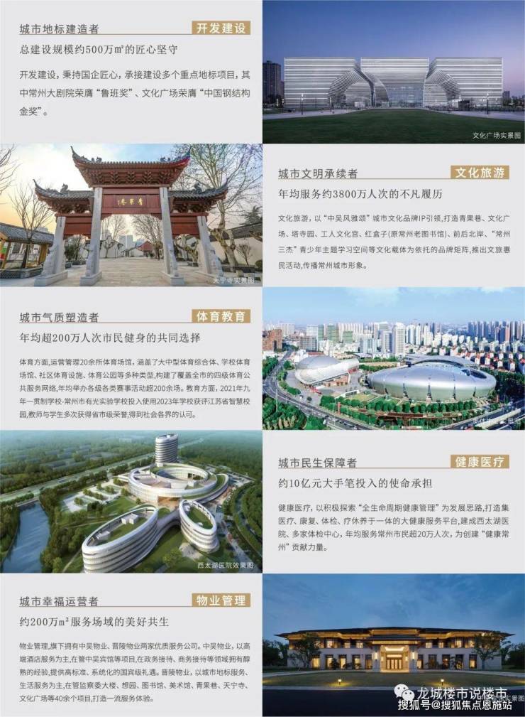 近年来,集团投资建设青果巷历史文化街区、常州文化广场、大运河风光带、天宁寺景区、西太湖医院等城市公共项目,以及众多城市文化教育体育设施,见证集团“建设美好城市,点亮民生幸福”的服务理念。