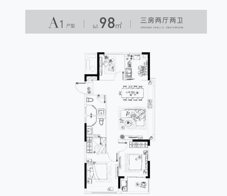 足够大的生活空间,才能满足一家人的多重需求,并承载整个家庭的幸福栖居。众安·泽翠居建筑面积约98㎡郎阔三房,将功能与尺度全方位升级,旨在让追求品质生活的人们,不断解锁生活的更多“享”法。