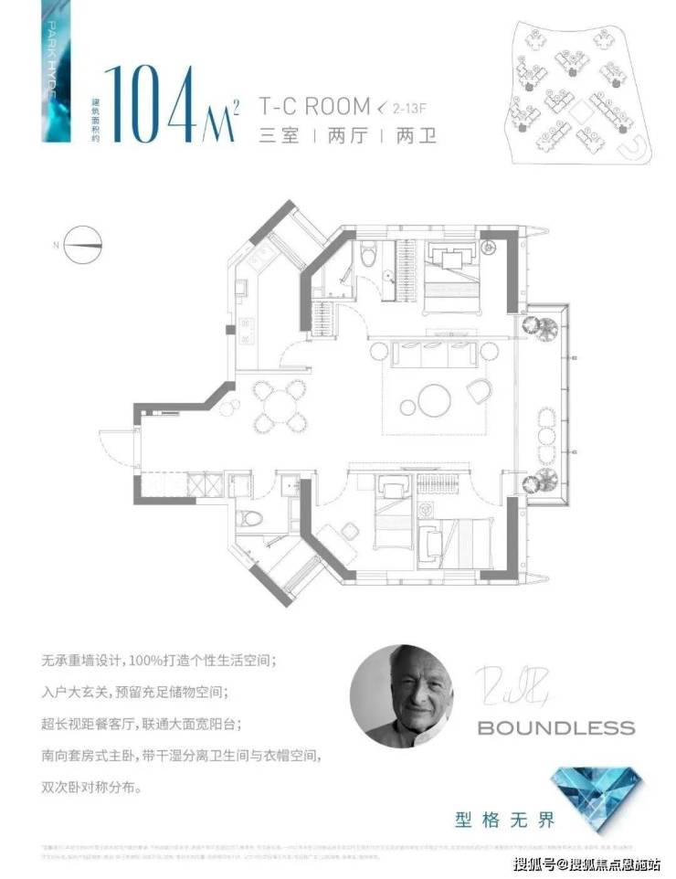 比如,建筑面积约104㎡3房,客厅面宽达到约3.6米,主
