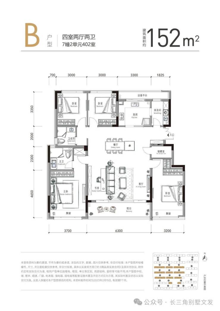 四房户型均为四叶草户型,方正通透,双阳台、最大至6.3米宽大尺度客餐厅,且均配置独立储藏间。