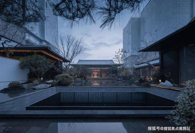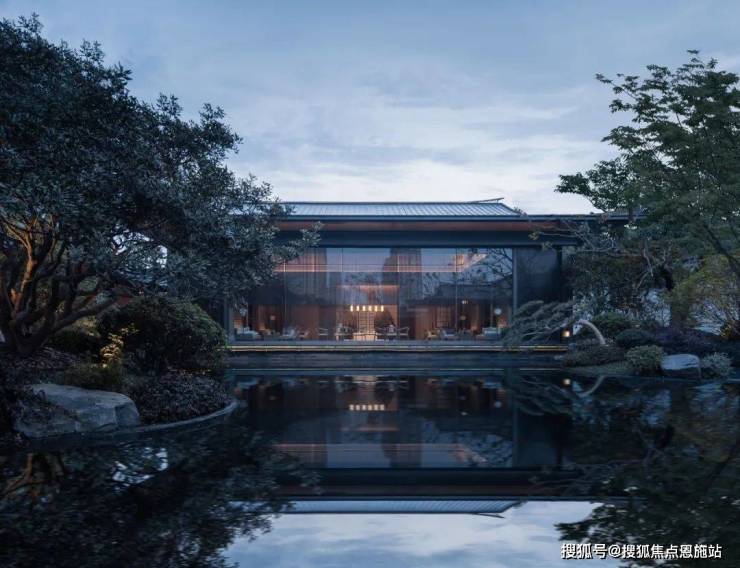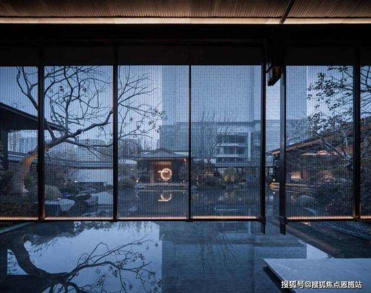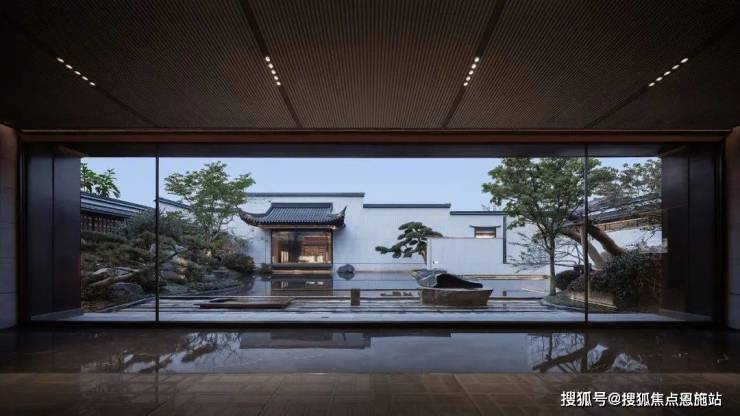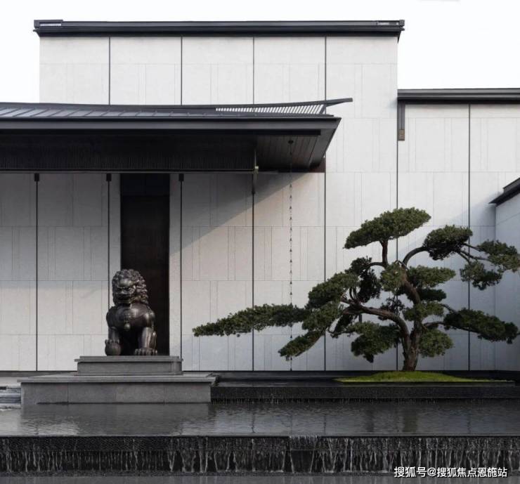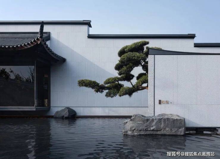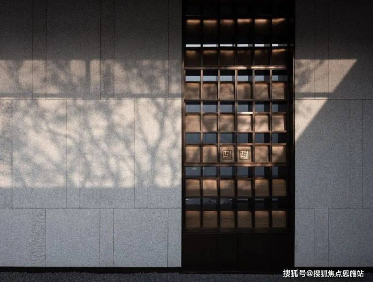 黑色屋檐与白金石材间强烈的黑白对比,辅以两侧金属网小窗点缀画面,如同吴冠中作品中明晰的黑白用色,运用大面留白的想象空间,加之一点一横的抽象窗形式,将人们的思绪停留于江南水乡的意境之中。
