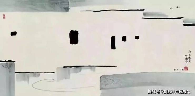经由空间疏密合理排布,线条以简驭繁,使得画面中横向线条、白色图底与纵向黑色色块之间形成强烈而平衡的对照关系,将吴冠中笔下《双燕》画作在框景中被重新诠释。