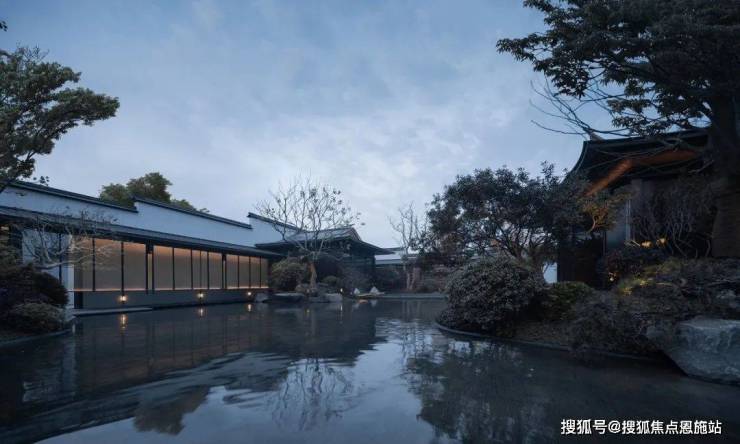 水镜四面建构池岸、连廊,结合层次分明、高低有致的马头墙,高耸遒劲的古松,传统形制屋顶与现代窗框结合的半座绣楼,呈合围环抱之势;