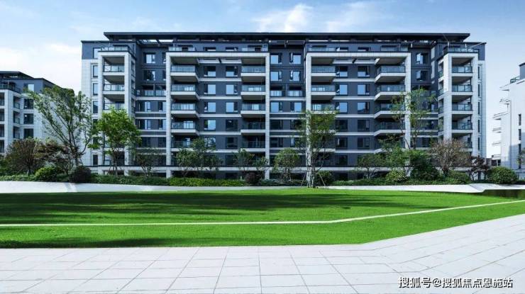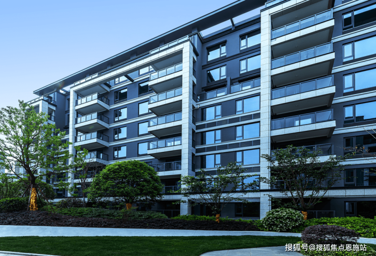 洋房外立面采用了高级灰现代风格,高级感十足,一层采用全干挂石材,其他楼层也用上了局部铝板以及大面积的玻璃,檐角采用三重倒退台式设计。