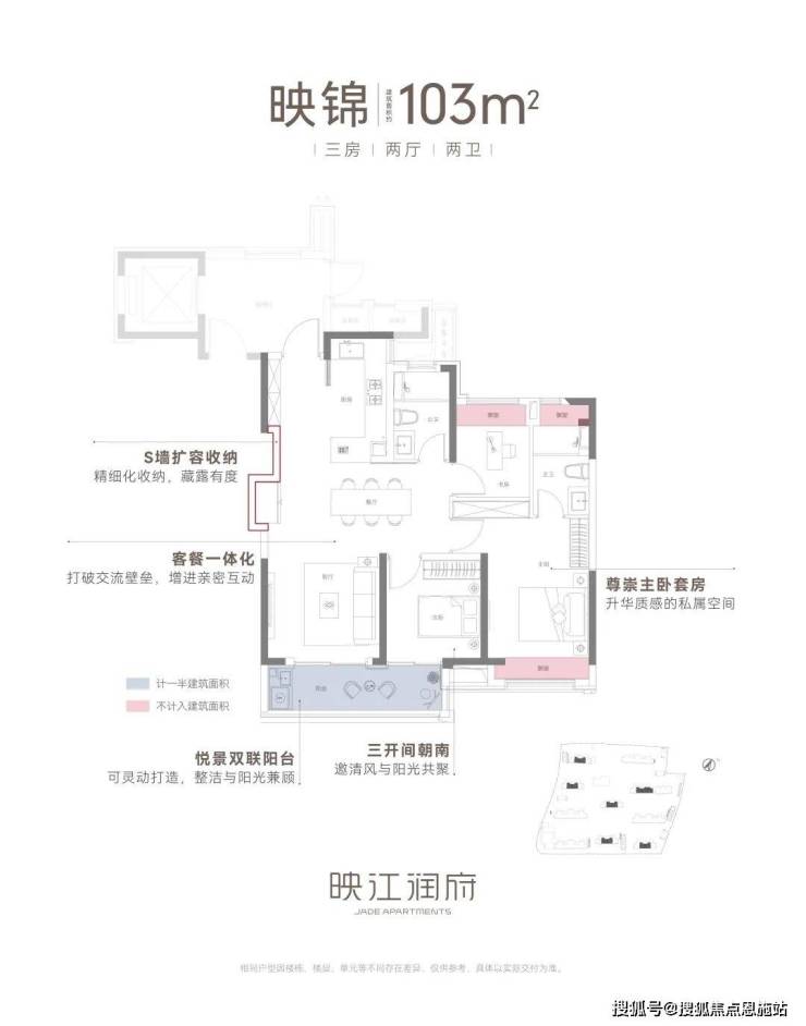 项目建面约103㎡中间套几乎保留了上述户型所有惊艳亮点,包括客餐一体化、双联阳台+多飘窗附赠、三开间朝南、套房主卧等。