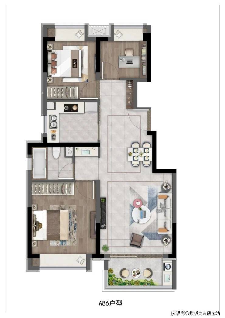 建面约86㎡3房2厅1卫户型,是多层洋房产品,做到了双开间朝南+全卧室带飘窗+南北通透+卫生间干湿分离,得房率大多高于普通的高层产品。