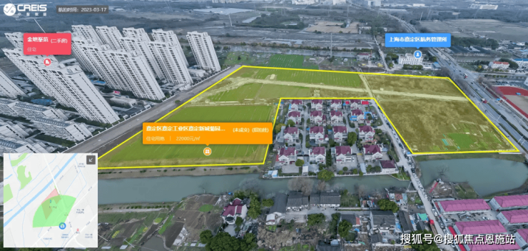4月19日,上海2023首轮土拍第三天,金地以总价291330万元价格,竞得嘉定区嘉定工业区嘉定新城菊园社区JDC1-0402单元06-01、06-03地块,地块占地面积60590.5㎡,容积率2.0,楼板价24041元/㎡,溢价率9.28%,房地联动价4.6万/m²。