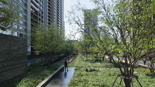 项目 售楼处电话:400-788-2939通过红线退让,主动消融社区与城市的边界,将空间归还于城市,实现更加步行友好的人行步道以及街角花园,创造出丰富的社区边界场景,比如为沿街商业预留了外摆等更多可能性,增加了社交与互动。