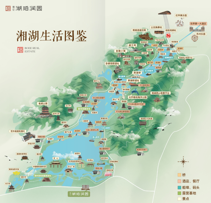 项目面向浩荡柔美的湘湖大景,项目依据地形肌理,由南至北打造「揽风」、「雅集」、「颂歌」,铺陈开一片美不胜收的“湖畔墅区新色”。