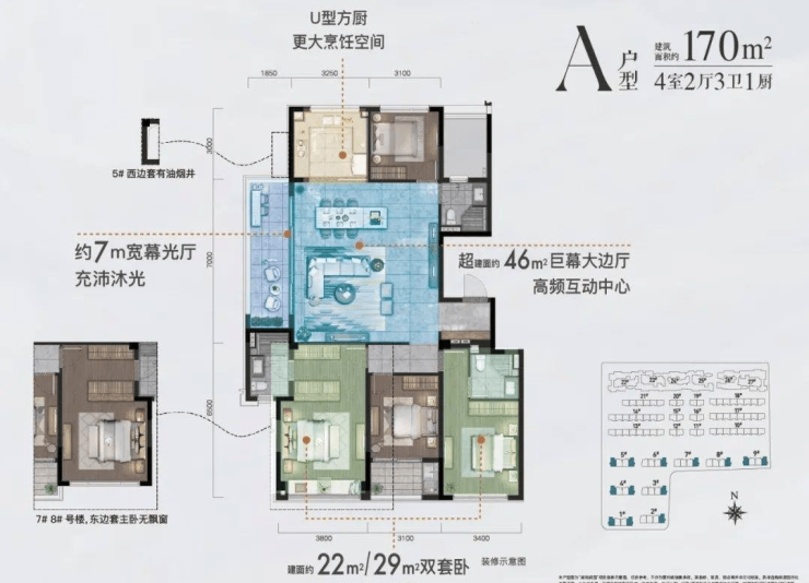 南向双套房,整体南向采光面近12米,还是市面上备受欢迎而眼下并不常见的“四叶草”设计,照顾到每位家庭成员的私密空间。