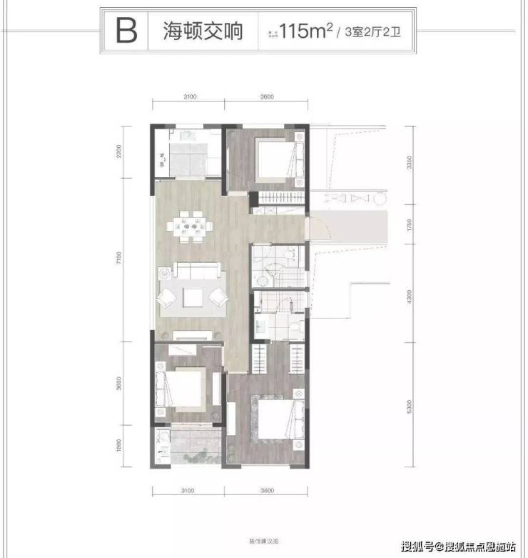 建筑面积约115方户型设计为三房两厅两卫,餐客一体加上横向落地窗,约7.1米的面宽让整个房间舒朗大气,景观视野极佳。