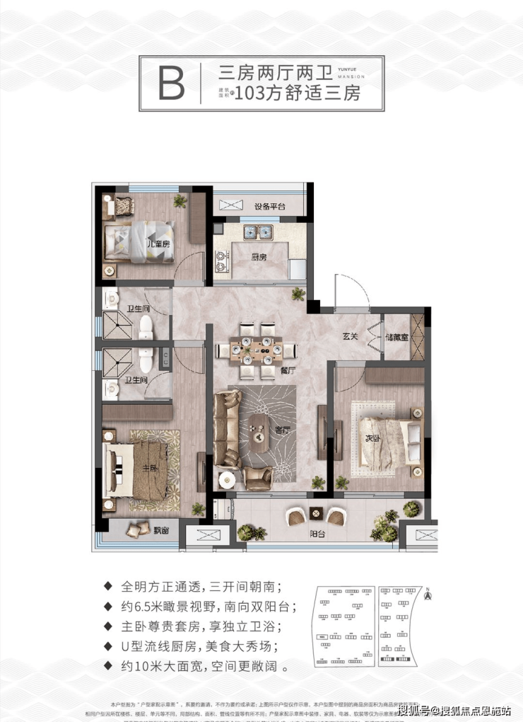 户型103方:全明户型方正通透,三开间朝南。约6.5米瞰景视野,南向双阳台。