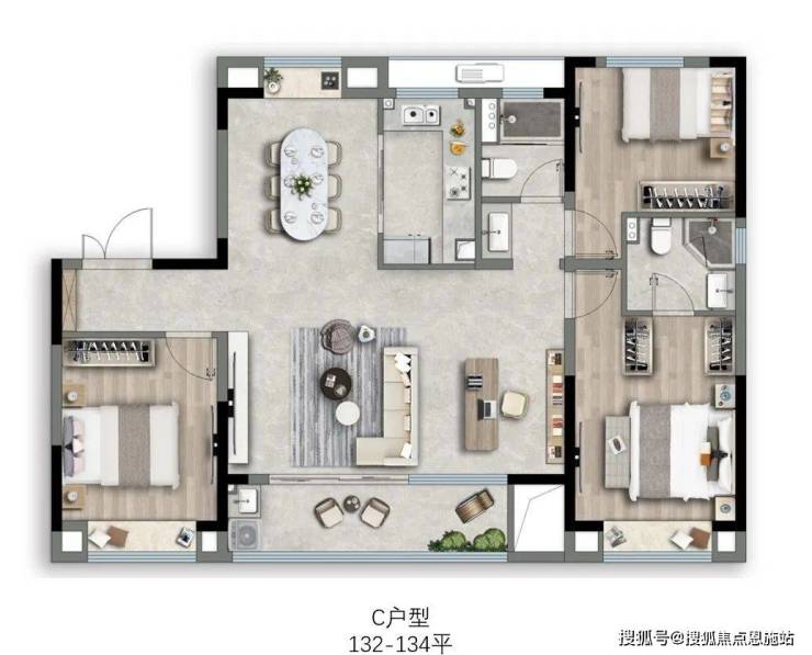 建面约132-134㎡:通透三室,约6.7米大横厅,南向4开间,百变灵动空间
