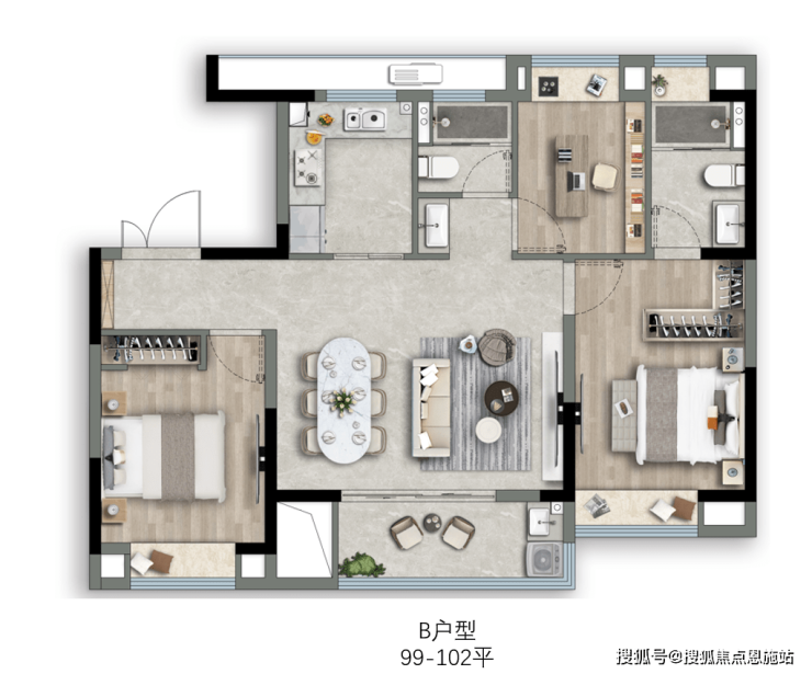 建面约99-102㎡:方正三室,约3.5开间,约5.1米宽厅,全明通透,套房主卧布局