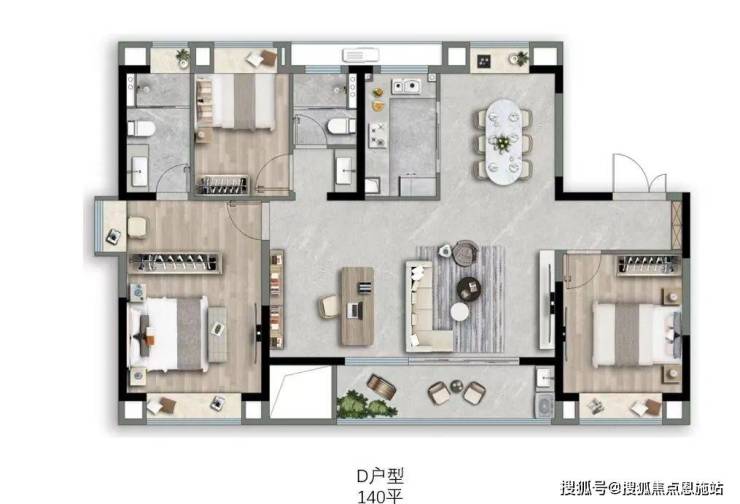 建面约142㎡:方正大三室,约7.4米超大横厅,套房式主卧,优享河景视野