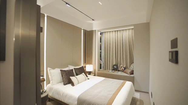 主卧入门北侧空间可以打造成一个衣柜,拓展室内的收纳空间。 市区建面约100㎡以内户型大多是2+1房设计,次卧远达不到如此宽敞,大多改造为书房,但 本项目2个次卧的可使用面积都比较高,放下一张1.5x2米的床毫无难度。且所有房间均有飘窗。