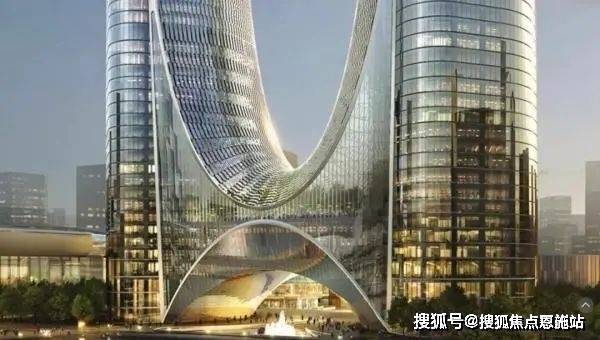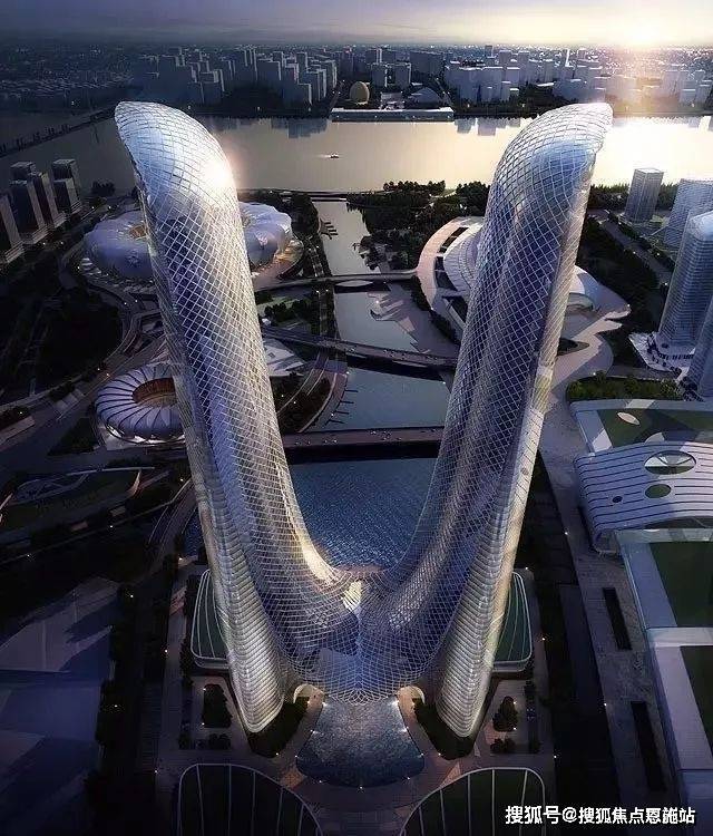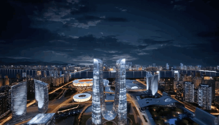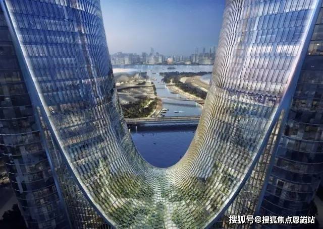 勾勒出城市崭新的天际线。双塔中间相连的弧线借鉴了杭州的特色景观——西湖断桥、